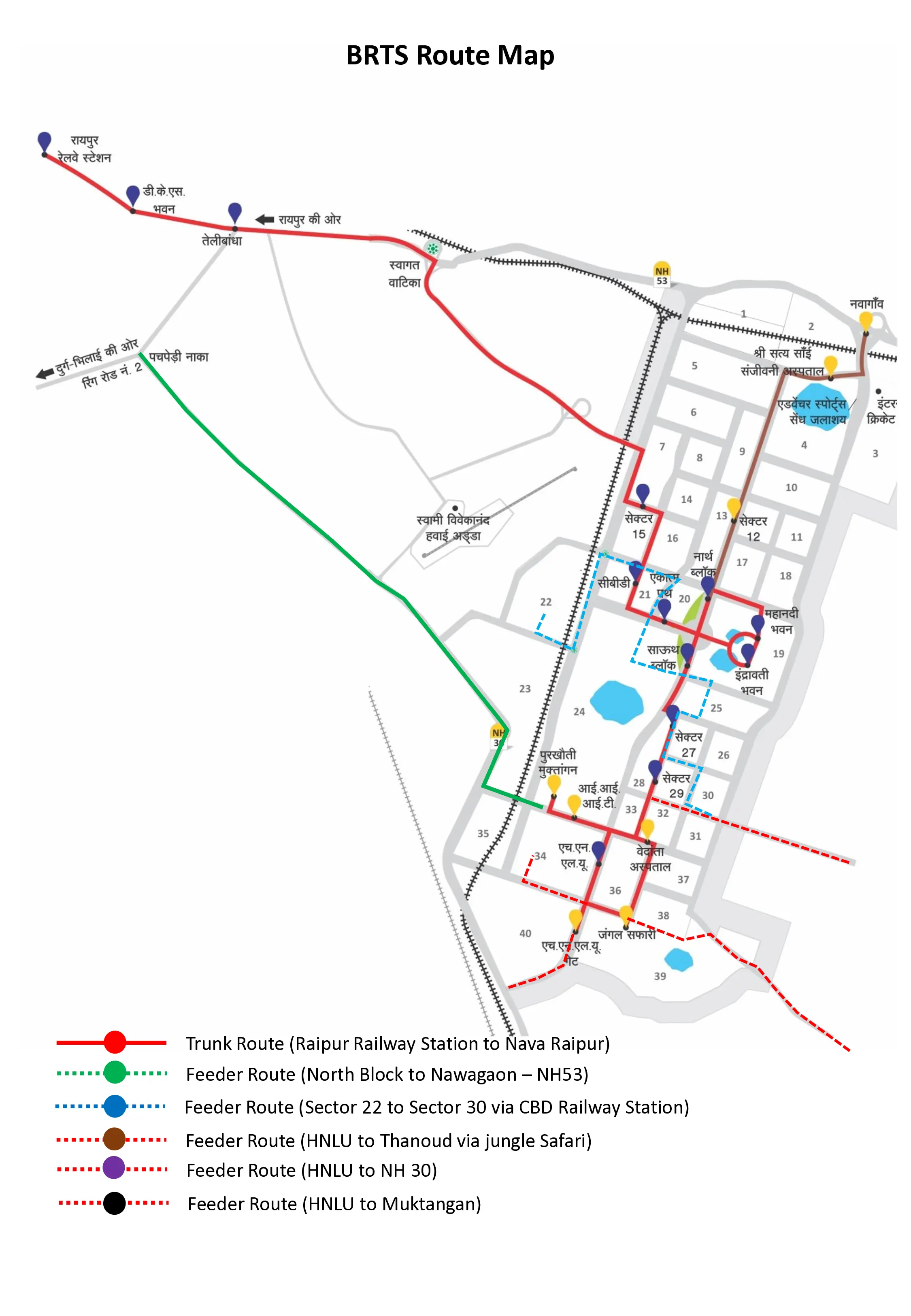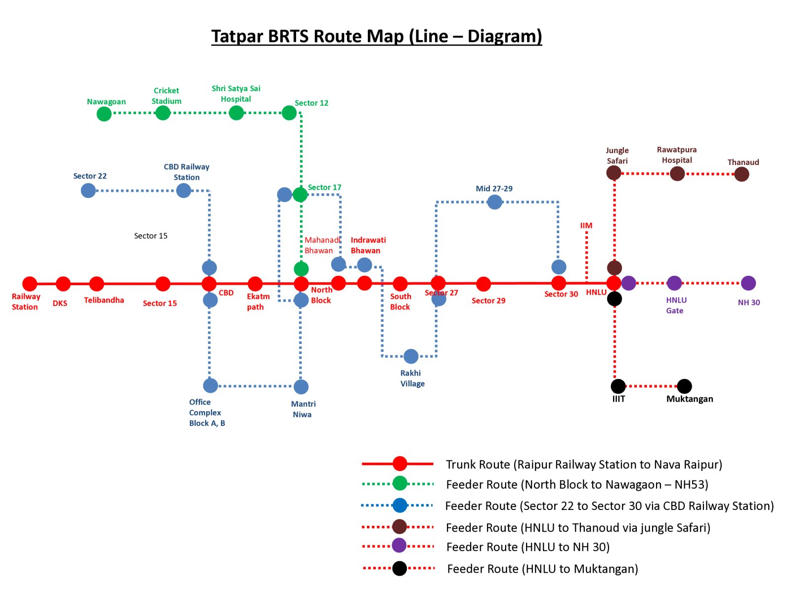 Explore the Tatpar BRT Lite corridor from Raipur Railway Station to HNLU in Nava Raipur. All BRTS stops are plotted on Google Maps with the full route line, schedule details, and official route diagrams.